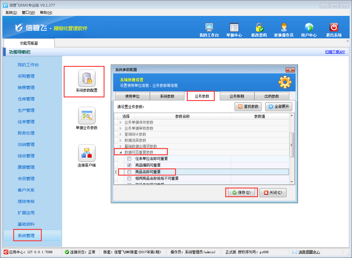以信管飛RMS為例,在系統管理—》系統參數配置—》業務參數內將“數據可否重復參數”中的“商品名稱可重復”參數的勾選取消,然后保存設置。如下圖所示: