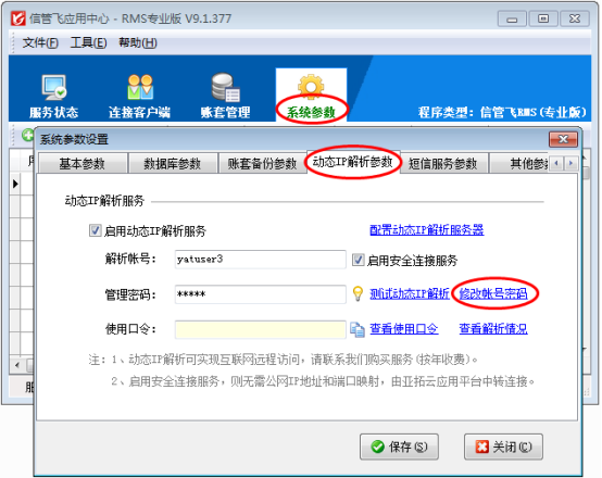 動態IP解析服務是亞拓軟件開發的基于互聯網的遠程連接解決方案,采用專屬安全技術,可以支持網絡版本在異地連接主機電腦進行共享數據使用。動態IP解析服務屬于增值服務,使用需要另外進行購買,購買后會分配解析賬號、管理密碼和使用口令信息,管理密碼和使用口令可以自己修改。下面我們以信管飛RMS為例介紹一下如何修改動態IP解析服務的管理密碼及使用口令。