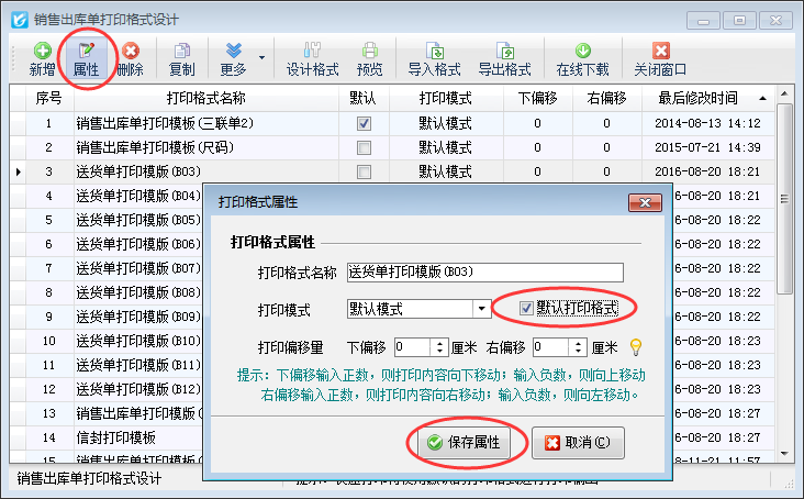 一、在打印格式設計界面工具欄的“屬性”中進行操作。如示例需要設置“送貨單打印模板(B03)”為默認模板,選擇B03模板,點擊工具欄中的“屬性”,彈出的打印格式屬性界面,在“默認打印格式”處打勾,然后保存屬性。如下圖所示: