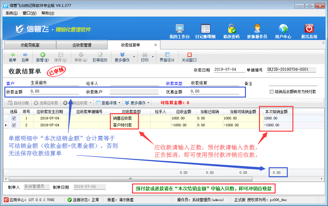注意:收款結算單單據明細中“本次結銷金額”的合計金額,必須等于可結銷金額(收款金額 + 優惠金額),否則無法保存收款結算單。