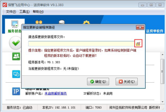 信管飛送貨單軟件、信管飛RMS軟件、信管飛倉庫管理軟件等都支持網絡版本(即可以多臺機器同時使用,數據共享,數據集中存儲在一臺機器上),軟件會不定期更新新版本,網絡版多臺電腦使用的時候,每次更新程序需要每臺電腦都下載最新版安裝程序進行安裝,非常麻煩。軟件支持在主機電腦的應用中心程序上指定更新安裝程序,便于客戶端登錄的時候如版本不一致會提示直接下載安裝程序。