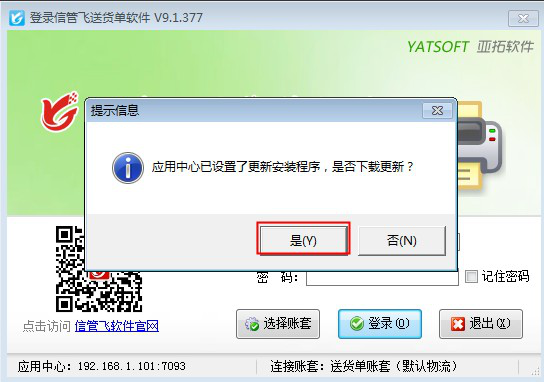 點擊確定按鈕后會提示“應用中心已設置了更新安裝程序,是否下載更新”,點擊“是”即可,會自動下載和應用中心版本一致的程序,如下圖所示: