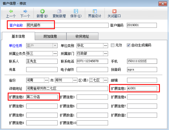 注:客戶(hù)的擴(kuò)展信息一共有十個(gè)可以使用,擴(kuò)展信息的名字可以通過(guò)界面設(shè)計(jì)進(jìn)行自定義修改。