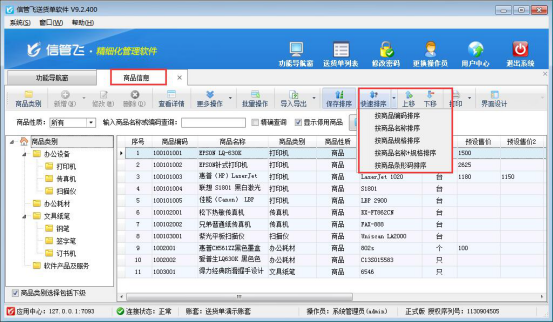 信管飛送貨單軟件、信管飛倉庫管理軟件、信管飛RMS軟件開單時(shí)都可以直接從商品信息中選擇已有的商品進(jìn)行快速開單,軟件都支持對商品信息進(jìn)行排序。開單添加明細(xì)時(shí)彈出的“選擇商品”窗口中商品信息顯示的先后順序如果需要調(diào)整,可以到商品信息中調(diào)整。下面我們以信管飛送貨單軟件為例介紹一下對商品信息排序的操作方法。