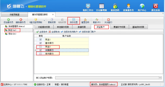參數“啟用資金賬戶權限控制”啟用成功后,使用系統管理員登錄軟件,在功能導航窗選擇“系統管理”—》“操作員及授權”進入操作員及授權管理界面,在權限模塊中可看到啟用的“資金賬戶權限”,添加操作員“張亞”,選擇操作員“張亞”后,打開資金賬戶權限,設置操作員“張亞”沒有“現金2和鄭州銀行”權限,保存設置,如下圖所示: