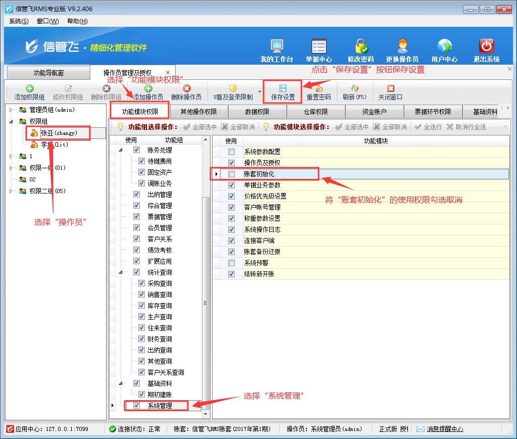 登錄軟件,在功能導航窗點擊“系統管理”—》“操作員及授權”,進入“操作員管理及授權”界面,選擇操作員“張亞”,在其右側的功能模塊權限內選擇“系統管理”模塊,將賬套初始化的“使用”權限勾選取消,然后保存設置,如下圖所示。