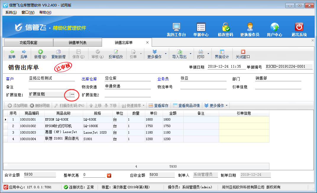 設置完成之后,在功能導航窗點擊“銷售管理”—》“銷售單列表”,打開一個已審核的銷售出庫單,然后點擊“擴展信息1”后的“...”按鈕可以直接修改擴展信息1內容,如下圖所示。