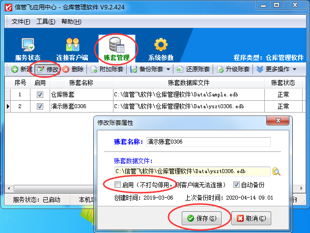 信管飛RMS、信管飛倉庫管理軟件、信管飛送貨單軟件、信管飛出納記賬軟件、信管飛票據(jù)打印軟件等軟件都含有賬套管理功能,在應(yīng)用中心內(nèi)支持建立多個賬套,已使用的帳套如果不再繼續(xù)使用,可以停用帳套,停用帳套后,客戶端程序登錄時將無法再連接該帳套。本文我們以信管飛倉庫管理軟件為例演示一下如何停用帳套。