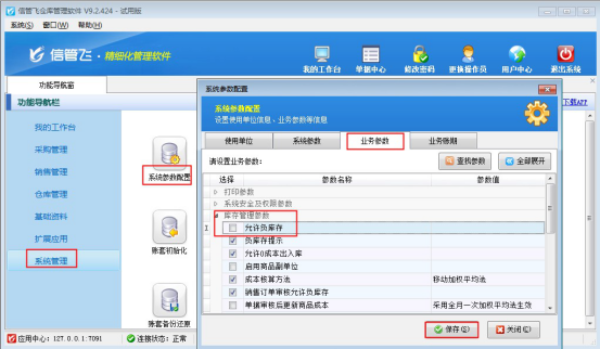在功能導航窗點擊“系統(tǒng)管理”—》“系統(tǒng)參數(shù)配置”—》“業(yè)務參數(shù)”,進入“業(yè)務參數(shù)”配置界面,在庫存管理參數(shù)中找到參數(shù)“允許負庫存”,取消勾選符號,點擊“保存”,如下圖所示: