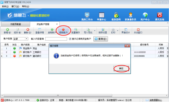 信管飛RMS標準版和專業版含有出納管理模塊,可以維護多個資金賬戶(現金賬戶與銀行賬戶),可以清清楚楚記錄每個賬戶的日常流水賬,實際業務需求中可能會出現資金賬戶變動,需要停用之前賬戶及設置在出納日記賬中不顯示此賬戶,下面我們以信管飛RMS專業版為例介紹一下如何停用資金賬戶并將已停用的資金賬戶設置為不顯示?
