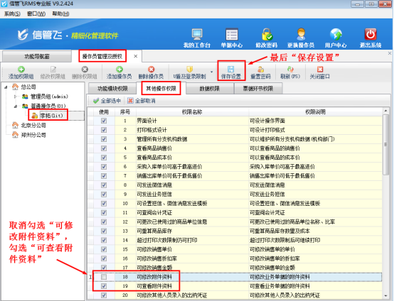 在功能導航窗點擊“系統管理”—》“操作員及授權”打開操作員管理及授權界面,選擇操作員“李拓”,在“其他操作權限”中,取消勾選“可修改附件資料”,勾選“可查看附件資料”,然后點擊“保存設置”按鈕保存權限設置,如下圖所示: