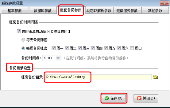 設置好備份目錄后,返回至應用中心程序“賬套管理”界面,選擇一個賬套,點擊“備份賬套”可以看到彈出的備份賬套的界面保存目錄為設置的保存目錄“桌面”上,如下圖3所示: