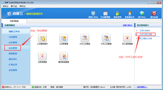 在功能導航窗點擊“綜合管理”—》“計件工資匯總表”即可進入員工計件工資匯總表界面,如下圖所示。