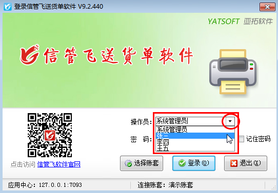 信管飛RMS(進銷存管理軟件)、信管飛倉庫管理軟件、信管飛出納記賬軟件、信管飛送貨單軟件等都支持設置多個操作員登錄軟件,操作員及授權實現對操作員的管理和權限分配。如果操作員離職了,軟件登錄窗口選擇操作員的列表中如何刪除此操作員呢?下面我們以信管飛送貨單軟件為例介紹一下如何刪除用不到的操作員。