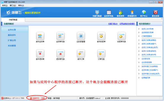 信管飛RMS、信管飛倉庫管理軟件、信管飛票據打印軟件、信管飛出納記賬軟件、信管飛送貨單軟件都包括客戶端程序和應用中心程序兩個模塊,客戶端程序登錄系統時,應用中心程序是必須打開的。如果主機電腦關機或關閉應用中心程序、程序出現異常等,客戶端程序與應用中心的連接就會斷開。應用中心程序再次正常運行后,客戶端程序需要重新建立與應用中心程序的連接。下面我們以信管飛送貨單軟件為例介紹一下客戶端程序重連應用中心程序的操作方法。