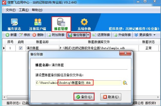 首先需要先在原電腦上備份下數據,打開紅色圖標應用中心程序,打開帳套管理界面。點擊“備份帳套”,可選擇備份路徑修改為桌面上,方便復制,備份文件為.dbk格式,如下圖所示: