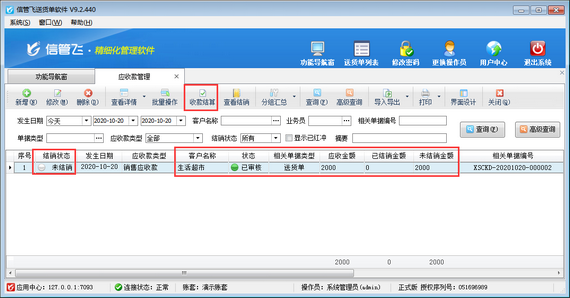 如下圖所示,客戶“生活超市”應收金額為2000元,已結銷金額為0。客戶在給我們支付貨款時只能支付1200元,剩余800元以后在付款。