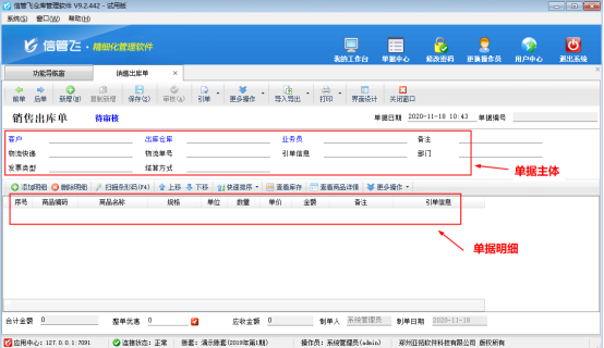 信管飛倉庫管理軟件業(yè)務(wù)單據(jù)的界面分為單據(jù)主體及單據(jù)明細(xì)兩部分,如圖1所示,單據(jù)默認(rèn)值功能是對單據(jù)主體的部分?jǐn)?shù)據(jù)項(xiàng)進(jìn)行設(shè)置默認(rèn)值,業(yè)務(wù)單據(jù)設(shè)置默認(rèn)值后,每次新增單據(jù)時(shí)會(huì)顯示已設(shè)置的數(shù)據(jù)項(xiàng)默認(rèn)值。