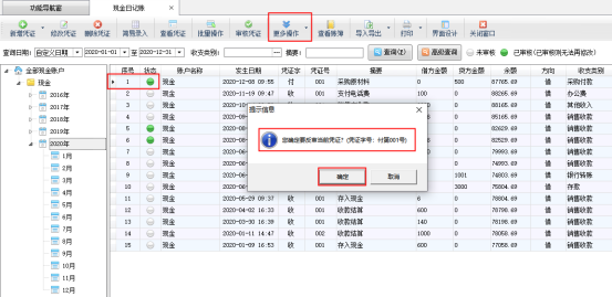 在現(xiàn)金日記賬列表界面,如圖2所示,點(diǎn)擊“更多操作”—》“反審憑證”,系統(tǒng)彈出提示信息“您確定要反審當(dāng)前憑證?”,點(diǎn)擊“確定”按鈕,如圖3所示。