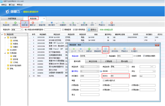 在功能導(dǎo)航窗點(diǎn)擊“基礎(chǔ)資料”—》“商品信息”打開(kāi)商品信息界面,以商品“洗衣機(jī)”為例,選擇商品后點(diǎn)擊“修改”按鈕,錄入成本價(jià)為850元,再保存商品信息,如圖1所示。