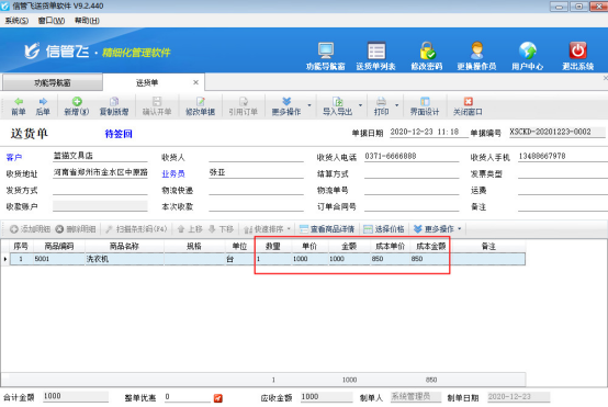 維護(hù)商品成本價(jià)之后,在功能導(dǎo)航窗點(diǎn)擊“業(yè)務(wù)處理”—》“新開(kāi)送貨單”,新增一個(gè)送貨單,添加商品“洗衣機(jī)”,銷售價(jià)為1000元,然后“確認(rèn)開(kāi)單”保存,如圖2所示。
