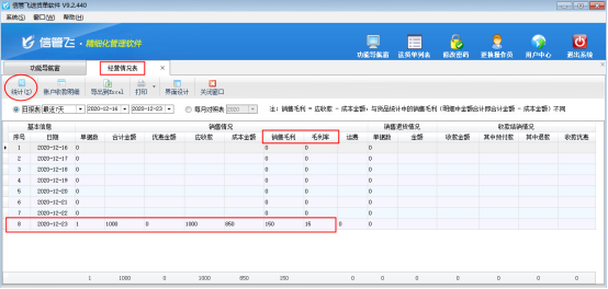 進(jìn)入經(jīng)營(yíng)情況表界面,可以選擇日?qǐng)?bào)表或每月對(duì)照表進(jìn)行統(tǒng)計(jì),點(diǎn)擊“統(tǒng)計(jì)”按鈕即可顯示該日期范圍內(nèi)的銷售情況、退貨情況及收款結(jié)銷情況,銷售情況中包括了銷售毛利、毛利率數(shù)據(jù)。今日應(yīng)收款金額為1000元,成本金額為850元,銷售毛利為150元(銷售金額-成本金額=銷售毛利),毛利率為15%(毛利率=毛利/營(yíng)業(yè)收入×100%=(營(yíng)業(yè)收入-營(yíng)業(yè)成本)/營(yíng)業(yè)收入×100% ),如圖4所示。
