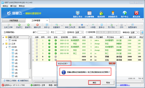 信管飛出納記賬軟件專(zhuān)業(yè)版包括工資管理功能,支持自定義工資模板,可根據(jù)設(shè)置的工資模板快速生成工資單,支持從上月工資單復(fù)制工資項(xiàng)目數(shù)據(jù),每月工資發(fā)放后,可將工資記錄標(biāo)記為簽領(lǐng)狀態(tài),如下圖所示,本文介紹一下出納記賬軟件中如何標(biāo)記工資記錄為已簽領(lǐng)狀態(tài)?