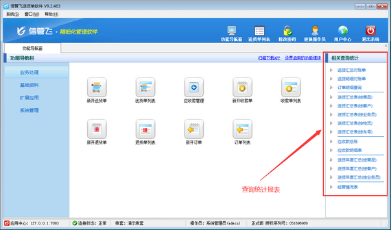 信管飛送貨單軟件為集訂單管理、送貨管理、收款結算等功能并支持送貨明細對賬及業務綜合對賬的送貨單打印軟件。軟件根據錄入的每張訂單及送貨單等數據,可以自動生成統計報表,完成企業銷售統計查詢和與客戶送貨明細對賬的目的,如下圖所示。如果不希望操作員賬號登錄后導出送貨明細對賬單,如何設置呢?本篇文章介紹一下具體操作步驟。