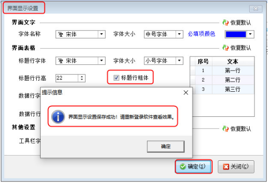 界面顯示設置窗口勾選“標題行粗體”,然后點擊“確定”,系統會提示“界面顯示設置保存成功!請重新登錄軟件查看效果。”如下圖3所示: