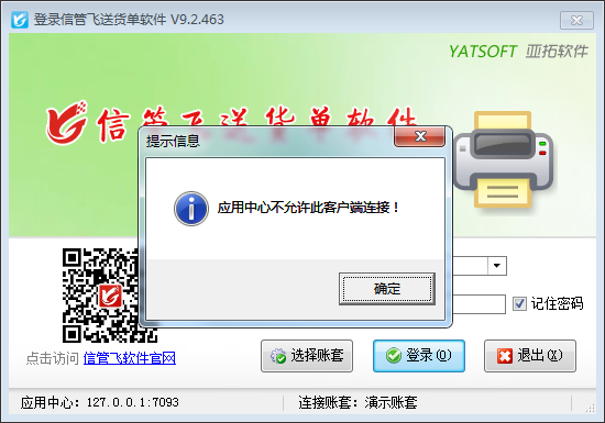 部分信管飛軟件用戶在登錄軟件時會出現軟件登錄不成功的情況,如下圖所示,系統彈出提示信息:應用中心不允許此客戶端連接!