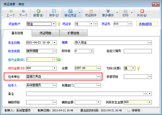 在功能導(dǎo)航窗點(diǎn)擊“出納管理”—》“現(xiàn)金日記賬”,新增日記賬憑證時(shí)選擇一下往來單位信息,如下圖所示。