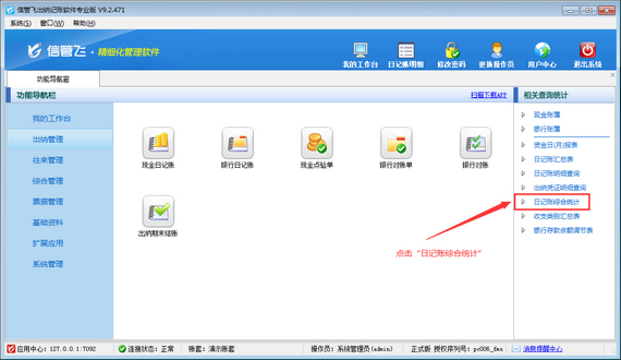 然后在“出納管理”模塊最右側(cè)的“相關(guān)查詢統(tǒng)計(jì)”內(nèi)點(diǎn)擊“日記賬綜合統(tǒng)計(jì)”,打開“日記賬綜合統(tǒng)計(jì)”界面,如下圖所示。