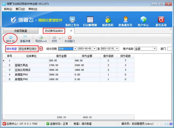 在“日記賬綜合統(tǒng)計(jì)”界面,統(tǒng)計(jì)類型選擇“按往來單位統(tǒng)計(jì)”,然后點(diǎn)擊“統(tǒng)計(jì)”按鈕,可以根據(jù)往來單位進(jìn)行統(tǒng)計(jì)。另外,系統(tǒng)支持根據(jù)日期、賬戶名稱、部門、經(jīng)手人等條件進(jìn)行統(tǒng)計(jì)查詢。
