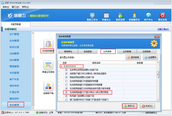 在功能導(dǎo)航窗點(diǎn)擊“系統(tǒng)管理”—》“系統(tǒng)參數(shù)”,選擇“業(yè)務(wù)參數(shù)”中數(shù)據(jù)選擇參數(shù)打開,勾選參數(shù)“在選擇商品窗口只顯示有出入庫記錄的商品”保存配置,如下圖所示: