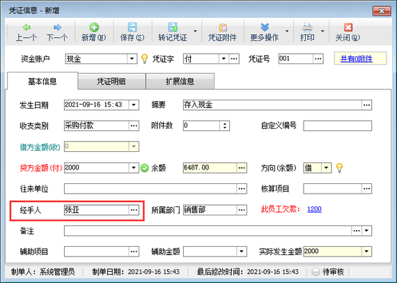 在功能導(dǎo)航窗點(diǎn)擊“出納管理”—》“現(xiàn)金日記賬”,新增日記賬憑證時(shí)選擇一下經(jīng)手人信息,如下圖所示。