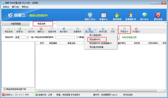 軟件導入需要一定的格式,導入的Excel模板可在軟件中導出,打開“基礎資料”—》“商品信息”,可先打開“界面設計”,先設置需要保留的數(shù)據(jù)項。然后在工具欄“導出導出”按鈕下選擇“導出Excel”,可導出當前設置界面為Excel模板,如下圖所示: