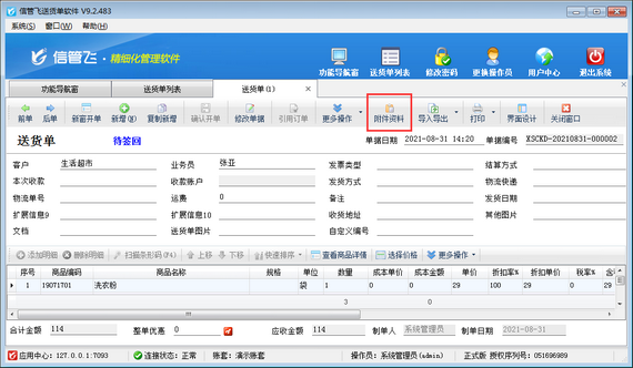 操作員權(quán)限設(shè)置完成后,選擇操作員“張亞”登錄軟件,打開(kāi)一個(gè)送貨單,然后可以看到送貨單界面工具欄已查看不到“附件資料”功能,操作員將無(wú)法再查看附件資料。