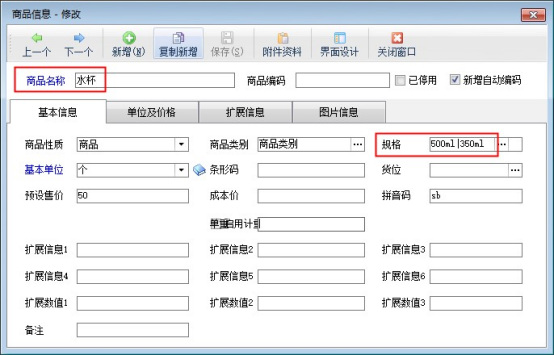 參數啟用保存后,在“基礎資料”—》“商品信息”中可添加商品,在規(guī)格中可區(qū)別開規(guī)格內容,示例商品:水杯(規(guī)格500ml和350ml),如下圖所示