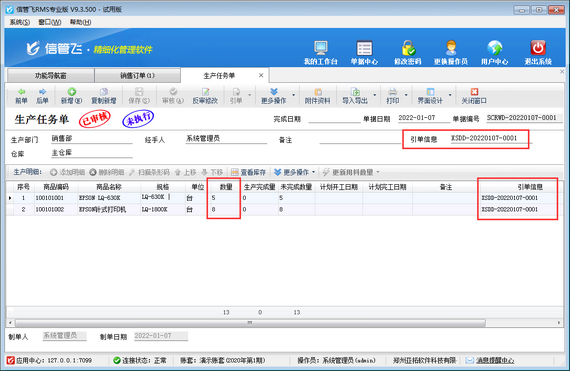 然后設(shè)置完成后,新開生產(chǎn)任務(wù)單引用銷售訂單的情況下,即可看到銷售訂單界面“已下達生產(chǎn)任務(wù)數(shù)量”可自動更新,如下圖所示。