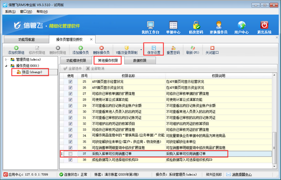 在功能導航窗點“系統管理”—》“操作員及授權”即可進入“操作員管理及授權”界面,選中操作員賬號,在“其他操作權限”界面將“采購入庫單可引用銷售訂單”權限打鉤取消,然后保存權限設置,如下圖所示,設置操作員張亞沒有“采購入庫單可引用銷售訂單”權限。