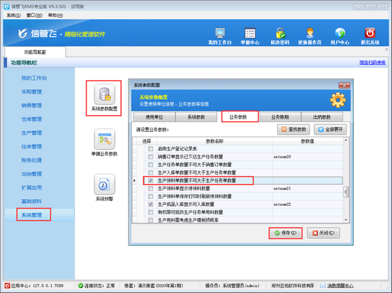 在功能導航窗點擊“系統(tǒng)管理”—》“系統(tǒng)參數(shù)配置”—》“業(yè)務參數(shù)”打開業(yè)務參數(shù)配置界面,在生產(chǎn)管理相關參數(shù)中打鉤啟用“生產(chǎn)領料單數(shù)量不可大于生產(chǎn)任務單數(shù)量”參數(shù),如下圖所示。