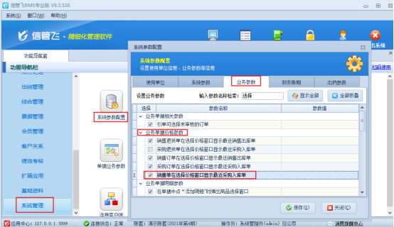 在功能導航窗點擊“系統管理”—》“系統參數配置”,在業務參數中勾選啟用參數“銷售單在選擇價格窗口顯示最近采購入庫單”,保存參數配置,如下圖所示: