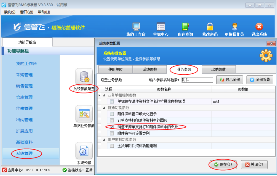 在功能導航窗點擊“系統管理”—》“系統參數”,選擇“業務參數”中的“銷售出庫單支持打印附件資料中的圖片”,勾選參數并保存配置,如下圖所示: