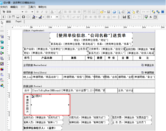 然后回到銷售出庫單界面,點擊“打印”—》“打印格式設計”—》“設計格式”,在打印模板上添加附件圖片數據項,如下圖所示: