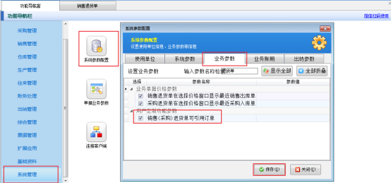 在功能導(dǎo)航窗點(diǎn)擊“系統(tǒng)管理”—》“系統(tǒng)參數(shù)配置”,進(jìn)入系統(tǒng)參數(shù)配置界面,點(diǎn)擊“業(yè)務(wù)參數(shù)”,勾選“銷(xiāo)售(采購(gòu))退貨單可引用訂單”參數(shù),點(diǎn)擊保存按鈕,如下圖所示: