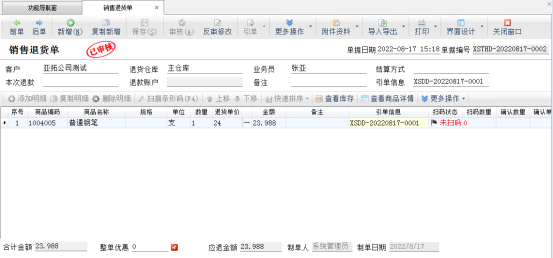 銷(xiāo)售退貨單引單訂單審核完成后,進(jìn)入銷(xiāo)售訂單管理界面,打開(kāi)引單過(guò)的銷(xiāo)售訂單,可以看到訂單的完成數(shù)量以及退貨數(shù)量已更新。