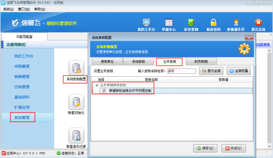 軟件多級(jí)審核最多支持5級(jí)審核,支持設(shè)置各類單據(jù)。本文以“銷售出庫單”為例示范。首先需啟用參數(shù),在功能導(dǎo)航窗點(diǎn)“系統(tǒng)管理”→“系統(tǒng)參數(shù)配置”→“業(yè)務(wù)參數(shù)”,勾選“單據(jù)審核啟用多環(huán)節(jié)權(quán)限控制”,點(diǎn)擊“保存”按鈕,如下圖所示: