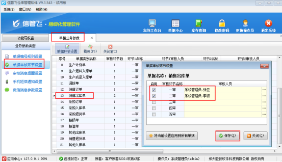 系統(tǒng)參數(shù)設(shè)置完成后,在“系統(tǒng)管理”→“單據(jù)業(yè)務(wù)參數(shù)”中選擇左側(cè)工具欄的“單據(jù)審核環(huán)節(jié)設(shè)置”,選擇“銷售出庫單”,點(diǎn)擊“單據(jù)環(huán)節(jié)設(shè)置”,啟用“一審”和“二審”并設(shè)置對(duì)應(yīng)審核環(huán)節(jié)的審核人員“張亞”和“李拓”,然后保存設(shè)置,如下圖所示: