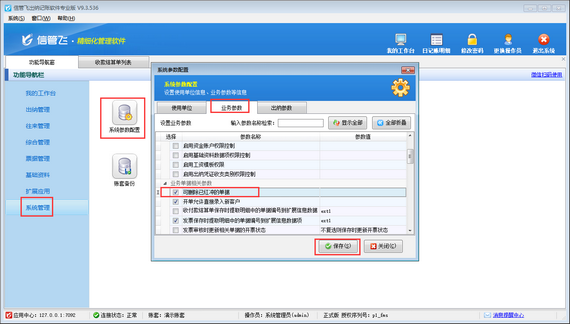 在功能導(dǎo)航窗點(diǎn)擊“系統(tǒng)管理”—》“系統(tǒng)參數(shù)設(shè)置”打開(kāi)業(yè)務(wù)參數(shù)界面,啟用參數(shù)“可刪除已紅沖的單據(jù)”,然后保存參數(shù)設(shè)置。