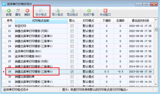 以送貨單軟件為例,選擇一個送貨單單據(jù),選擇“打印”—》“打印格式設計”—》“設計格式”進入打印模板設計器頁面,如下圖所示: